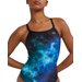 Jeśli chodzi o konstrukcję, strój kąpielowy TYR charakteryzuje się średnim dekoltem, co zapewnia optymalny balans między wygodą a pewnym dopasowaniem. Elastyczne, cienkie ramiączka, które krzyżują się na plecach, nie tylko dodają elegancji, ale także zapewniają doskonałą swobodę ruchów, co jest kluczowe podczas pływania. Okrągłe wycięcie na plecach oraz umiarkowanie wycięte nogawki dodatkowo podkreślają funkcjonalność i nowoczesny design tego stroju. Wyjątkowy wzór nadaje mu niepowtarzalnego charakteru, który przyciąga uwagę i wyróżnia się na tle klasycznych modeli. Logo na przodzie subtelnie podkreśla markę, nie dominując przy tym całego designu. Dzięki antybakteryjnej podszewce, strój zapewnia nie tylko komfort noszenia, ale także dba o higienę, co jest istotnym aspektem w przypadku produktów przeznaczonych do intensywnego użytkowania w wodzie.