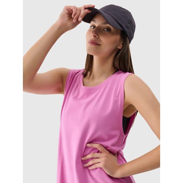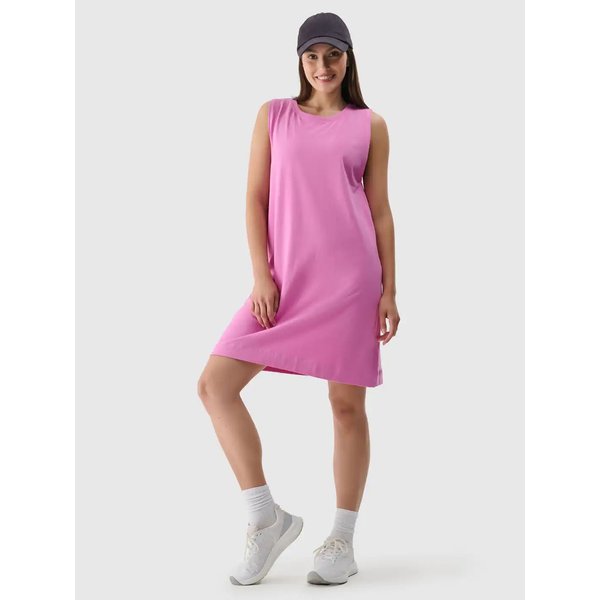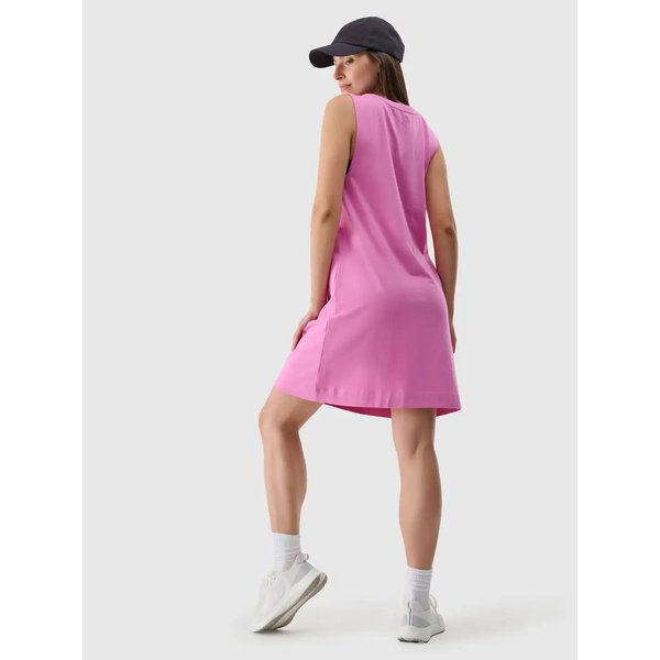 Damska sukienka od 4F to połączenie elegancji i komfortu, które sprawia, że jest idealnym wyborem na wiele okazji. Wykonana z miękkiej, oddychającej dzianiny, zapewnia wyjątkowy komfort noszenia dzięki przewadze bawełny w składzie. Dodatek elastanu sprawia, że materiał delikatnie dopasowuje się do sylwetki, podkreślając jej atuty, a jednocześnie nie krępuje ruchów. Prosty krój i długość do kolan nadają sukience uniwersalny charakter, który doskonale sprawdzi się zarówno na co dzień, jak i podczas bardziej formalnych wyjść. Okrągły dekolt dodaje jej subtelności.