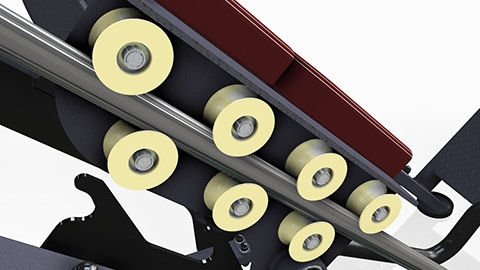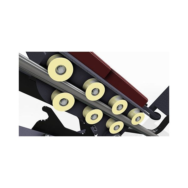W najnowszej wersji maszyny zastosowaliśmy całkowicie nowy system blokowania oraz prowadzenia wózka. Wózek porusza się na łożyskowanych rolkach wykonanych z mocnego poliamidu, co gwarantuje płynną oraz niezwykle cichą pracę urządzenia.