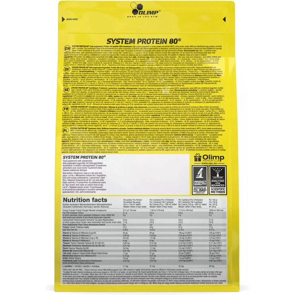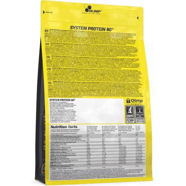 Unikatowy skład System Protein 80® bazuje na najwyższej jakości koncentracie białek serwatkowych, białku jaja kurzego oraz ekskluzywnym izolacie białek serwatki, do otrzymania którego zaprzęgnięta została ultranowoczesna machina technologiczna w postaci mikrofiltracji w przepływie krzyżowym (CFM). Stworzony przez bezkompromisową kadrę naukową Olimp Laboratories kompleksowy matrix proteinowy ma na celu bardzo szybkie nasycenie krwi najbogatszym ze znanych profili aminokwasowych oferowanym jednocześnie przez białka serwatkowe i jajeczne. System Protein 80® generuje ekstremalnie skuteczniejszą falę uderzeniową aminokwasów, w jednej chwili zaprzęgającą wszelkie mechanizmy metaboliczne organizmu do rozpoczęcia procesu syntezy białek. Ten niezwykle sprzyjający stan fizjologiczny będzie się utrzymywał na stabilnym poziomie przez następne 3 godziny od chwili podania.