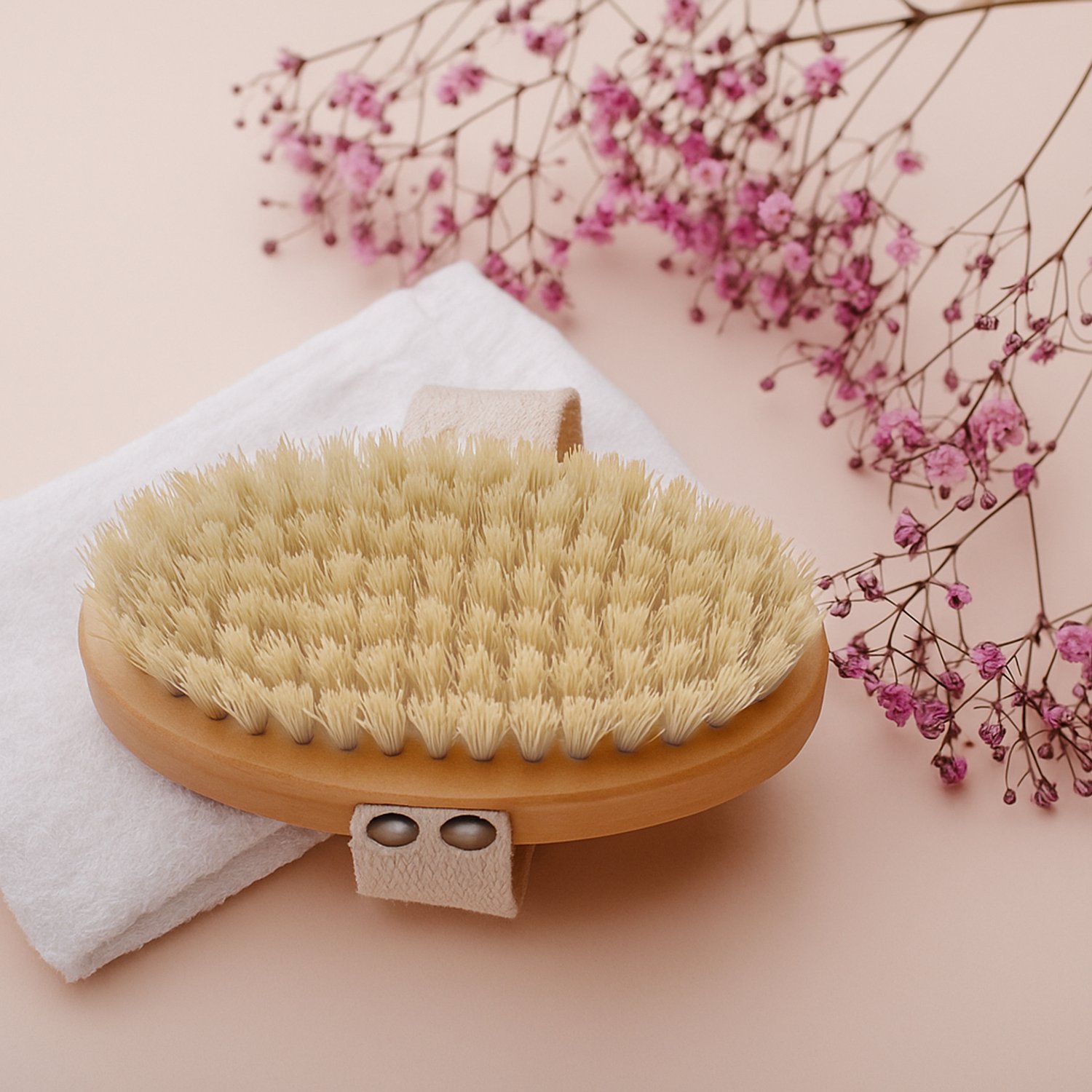 - Stabilny chwyt podczas masażu: Szeroki pasek z naturalnej tkaniny ułatwia kontrolę nad szczotką i zapewnia pewny, komfortowy chwyt – nawet podczas dłuższych sesji pielęgnacyjnych.