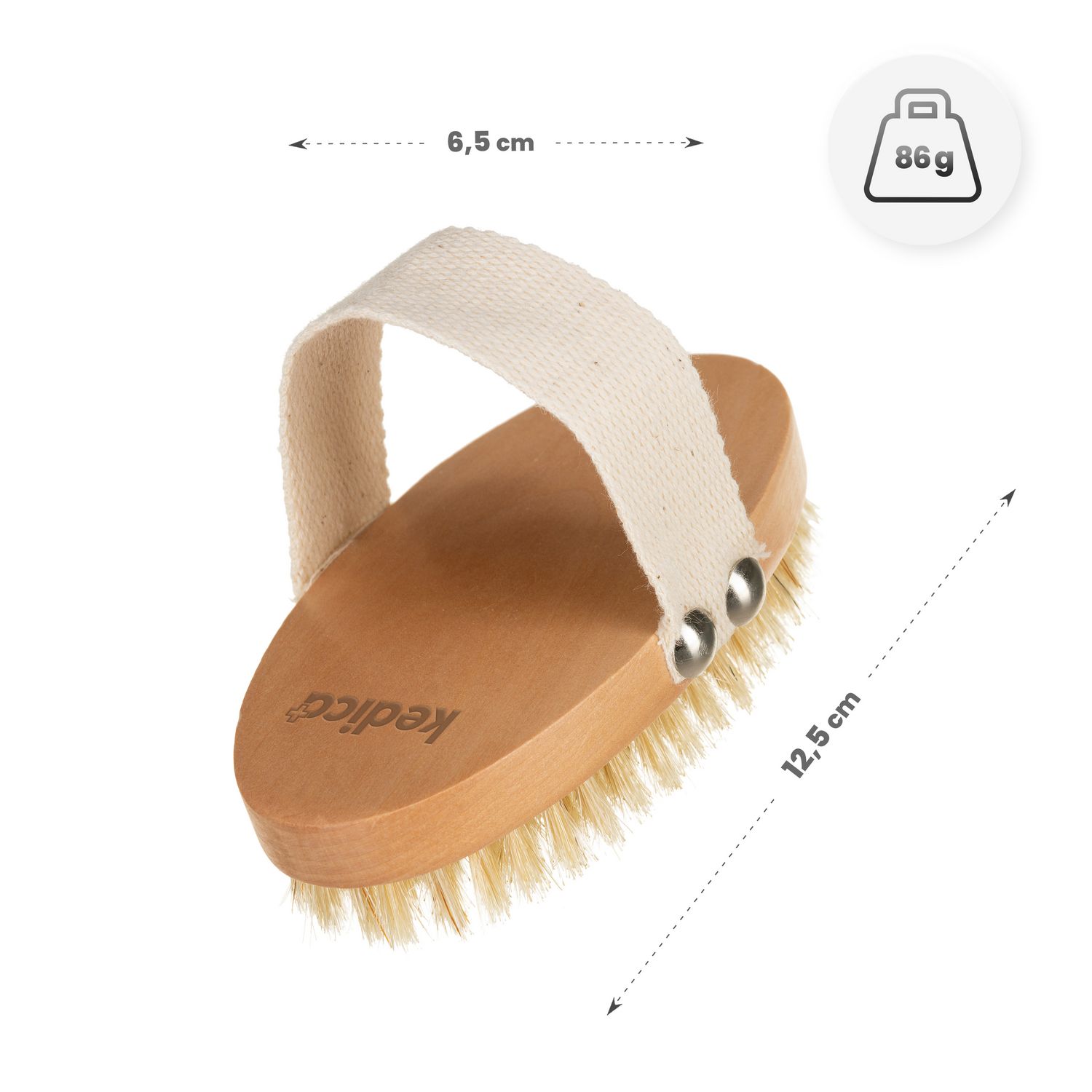 Szczotka do masażu Kedica została wyposażona w średnio-twarde włosie, które skutecznie usuwa martwe komórki naskórka bez nadmiernego podrażnienia skóry. Regularne stosowanie wspiera naturalne procesy regeneracyjne, poprawiając strukturę skóry i nadając jej zdrowszy wygląd. To doskonałe narzędzie do walki z cellulitem.
