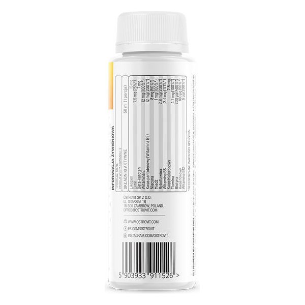 OstroVit SUNbeam Multivitamins Shot to suplement diety bogaty w witaminy i mikroelementy, które wspierają zdrowie i piękny wygląd skóry. Zawiera likopen, cynk, beta-karoten, witaminę E, kwas pantotenowy, niacynę, miedź, ryboflawinę, witaminę B6, kwas hialuronowy, tiaminę, biotynę, kwas foliowy i witaminę B12. Składniki te zapewniają ochronę przed stresem oksydacyjnym, regulują pracę układu nerwowego, utrzymują prawidłowy metabolizm i zachowują zdrowy stan skóry, włosów i paznokci. Kwas hialuronowy zwiększa elastyczność skóry, a cynk pomaga w utrzymaniu pigmentacji skóry i włosów. OstroVit SUNbeam Multivitamins Shot to doskonały wybór dla osób chcących cieszyć się piękną i zdrową skórą.