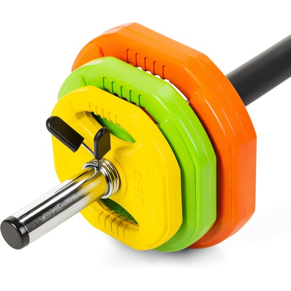 Gumowane obciążenia skutecznie tłumią uderzenia, chroniąc powierzchnię podłogi i ograniczając hałas, co zwiększa komfort ćwiczeń w domowych warunkach. Sprężynowe zaciski gwarantują szybkie i stabilne mocowanie talerzy, eliminując ryzyko ich przesuwania się w trakcie ruchu.