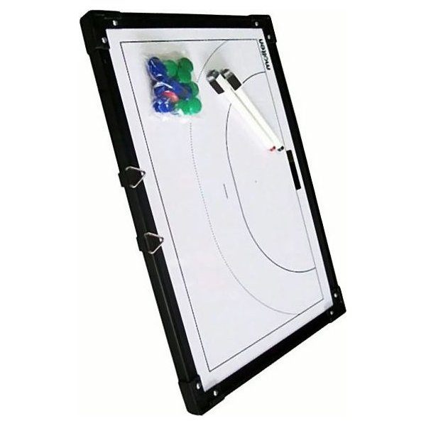 Tablica jest magnetyczna i dzięki specjalnym magnesom, które są w zestawie, możesz przedstawić każdą sytuację na boisku. Do tego pomocny też będzie czarny flamaster, który bez trudu zmażesz za pomocą specjalnej gąbki. Nie potrzebujesz wody ani innych specyfików - całe ścieranie flamastra odbywa się na sucho. Wymiary tablicy to 45x30,5cm, a dzięki temu, że w zestawie otrzymasz także praktyczny pokrowiec, korzystanie z niej jest jeszcze wygodniejsze i praktyczniejsze.