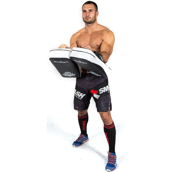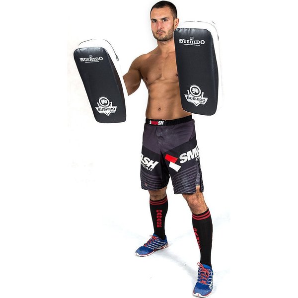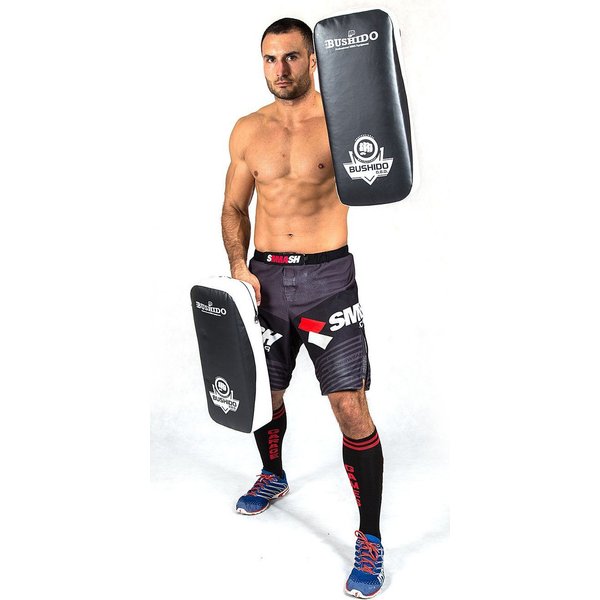 Tajska tarcza treningowa o wydłużonym profilu Bushido pozwala chronić przedramię i łokieć. Tarcza została wypełniona pianką poliuteranową tzw. regenerat o twardości 90 lg/m3, który cechuje się bardzo dobrą amortyzacją uderzeń i większą trwałością, dzięki czemu dłużej posłuży. Wykonanie z 7 warstwowego plawilu z wtopioną siatką nylonową minimalizuje ryzyko rozdarcia podczas treningu.