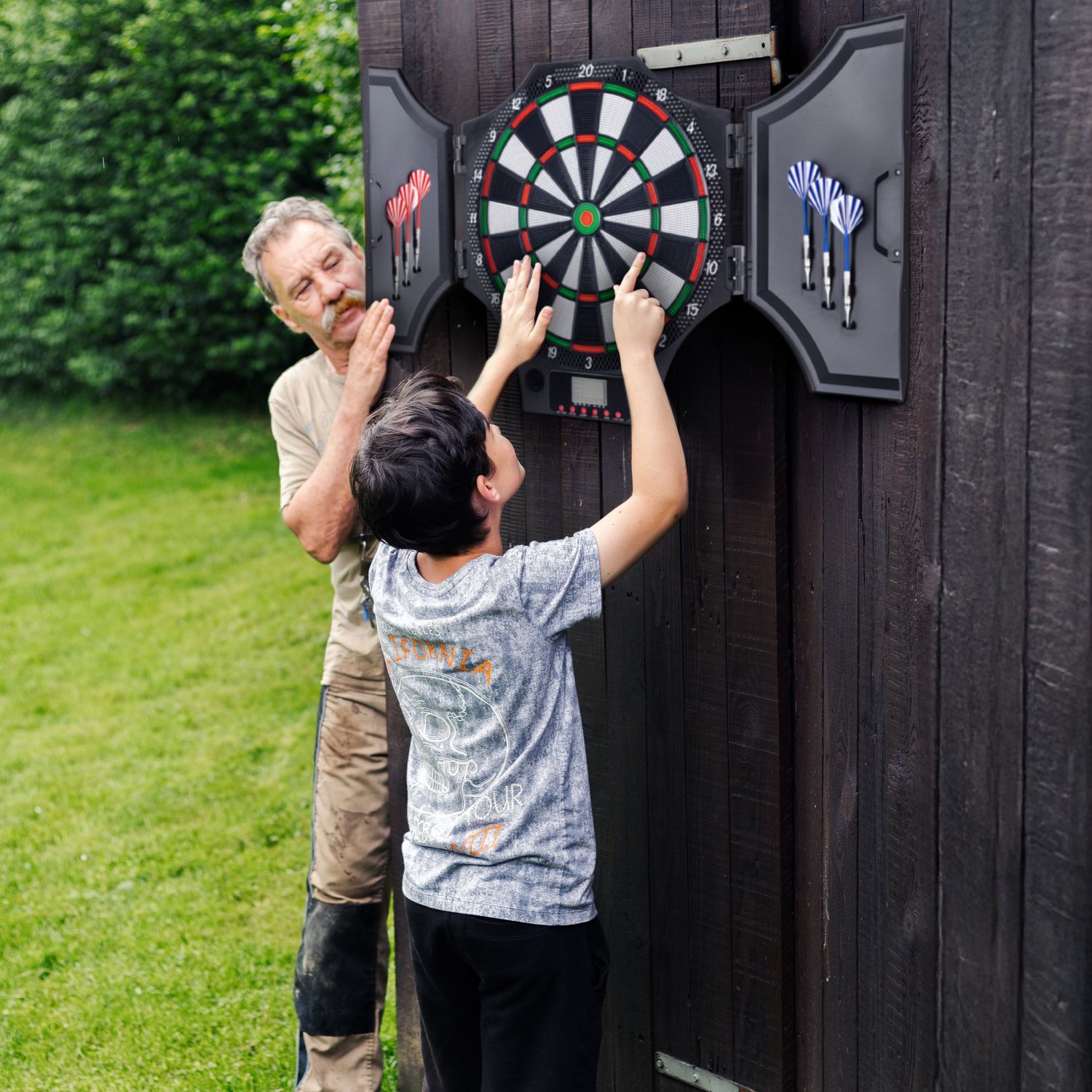 - Praktyczne drzwiczki ochronne i bogaty zestaw: Zamykana obudowa chroni tarczę przed kurzem i uszkodzeniem, a w komplecie znajduje się 6 rzutek oraz 12 wymiennych końcówek – gotowe do gry od razu po rozpakowaniu.