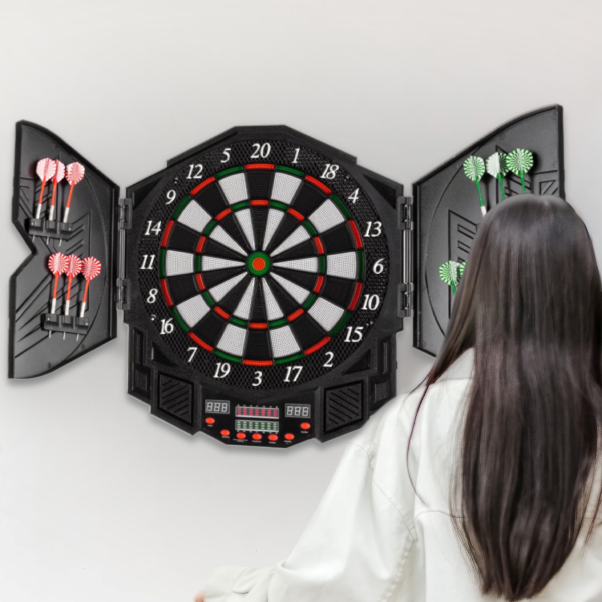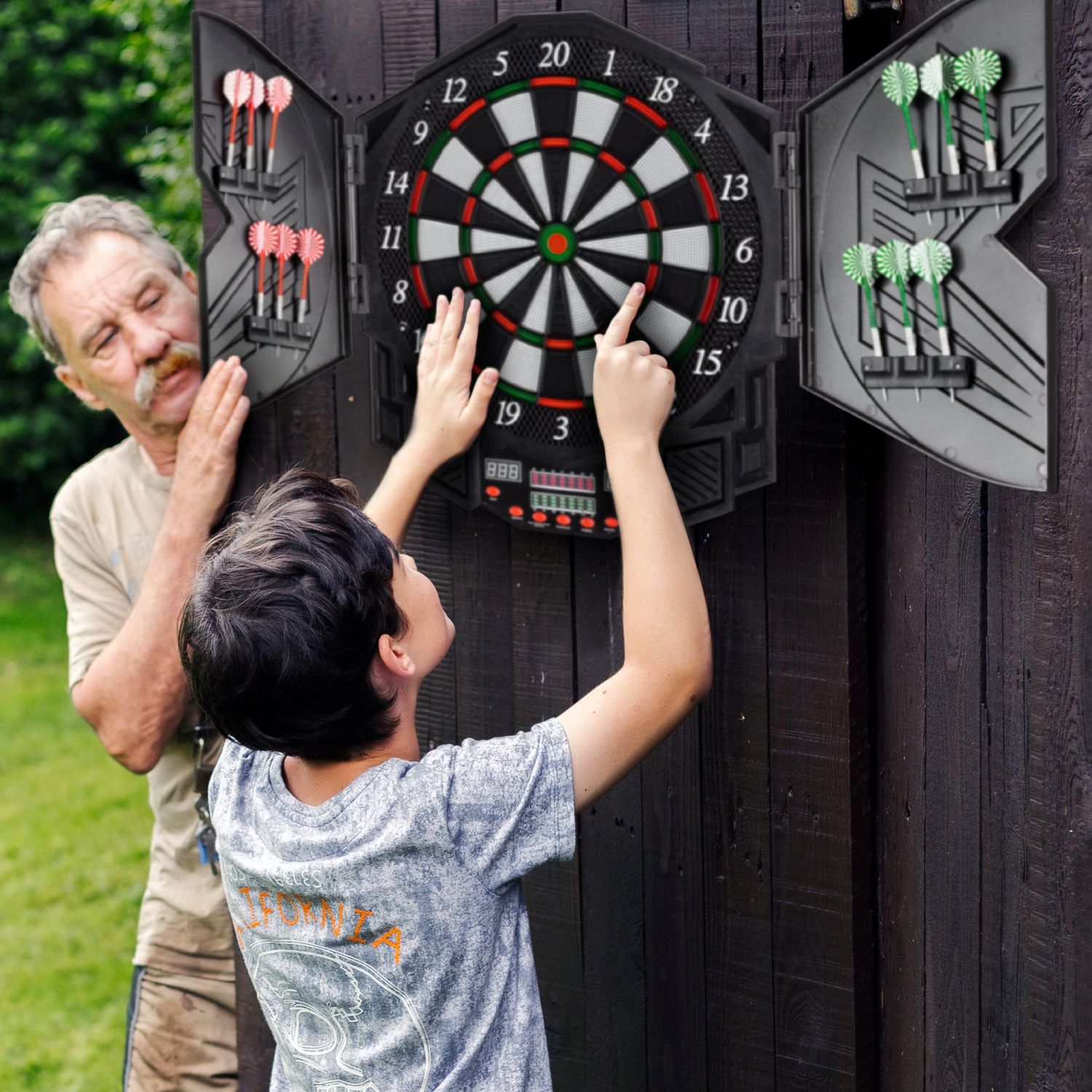 - Praktyczne drzwiczki ochronne i bogaty zestaw: Zamykane drzwiczki chronią tarczę przed kurzem, a zestaw z 12 rzutkami, 24 zapasowymi końcówkami i zasilaczem pozwala rozpocząć grę od razu po rozpakowaniu.