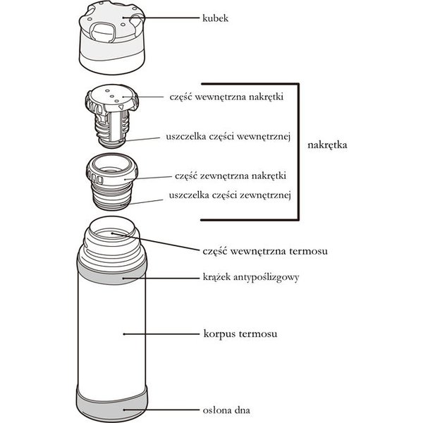 Podwójna nakrętka ułatwia otwieranie i zamykanie termosu. Wewnętrzna część nakrętki wyposażona jest w podwójny gwint o większej długości, dzięki czemu wystarczy wewnętrzną część nakrętki przekręcić tylko o pół obrotu i można już nalewać płyn (standardowe nakrętki trzeba całkowicie przekręcić). Korpus ze stali nierdzewnej sprawia, że Mountain jest wysoce odporny na uszkodzenia mechaniczne.