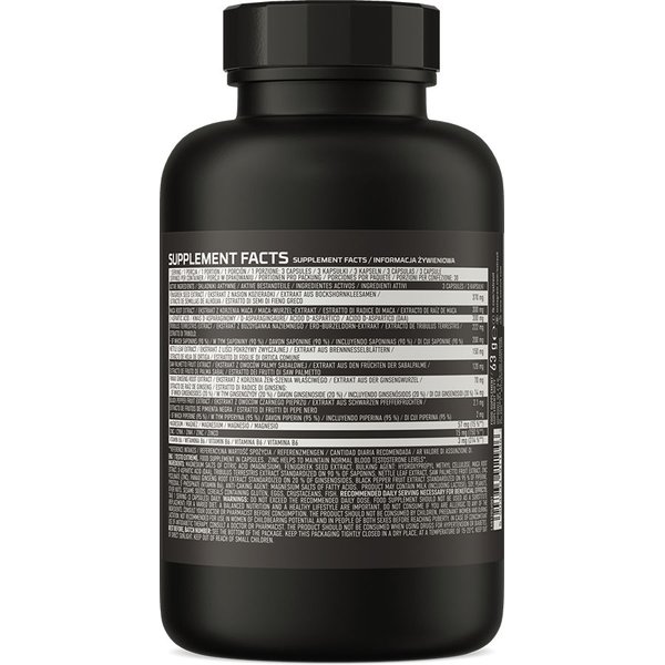Sole magnezowe kwasu cytrynowego (magnez), ekstrakt z nasion kozieradki pospolitej (Trigonella foenum-graecum L.), substancja wypełniająca: hydroksypropylometyloceluloza, ekstrakt z korzenia maca (Lepidium meyenii Walp.), kwas D-asparaginowy (DAA), ekstrakt z buzdyganka naziemnego (Tribulus terrestris L.) standaryzowany na 90% saponin, ekstrakt z liści pokrzywy zwyczajnej (Urtica dioica), ekstrakt z owoców palmy sabałowej (Serenoa repens (W.Bartram) Small), pikolinian cynku (cynk), ekstrakt z korzenia żeń-szenia właściwego (Panax ginseng C.A. Meyer) standaryzowany na 20% ginsenozydów, ekstrakt z owoców czarnego pieprzu standaryzowany na 95% piperyny, pirydoksalo-5-fosforan (witamina B6), substancja przeciwzbrylająca: sole magnezowe kwasów tłuszczowych.