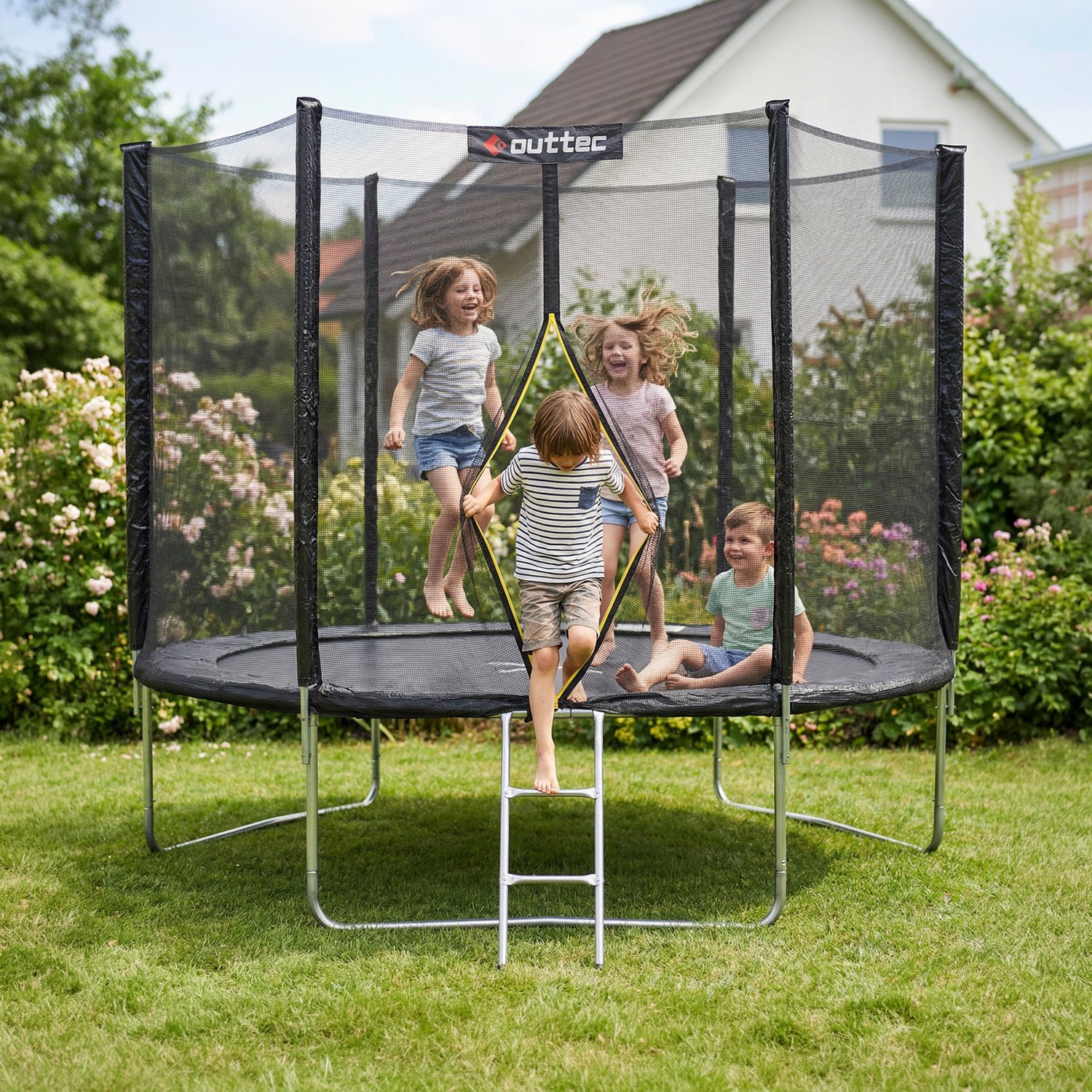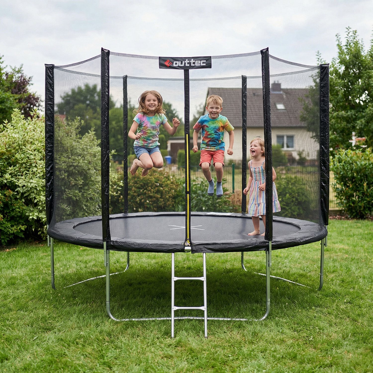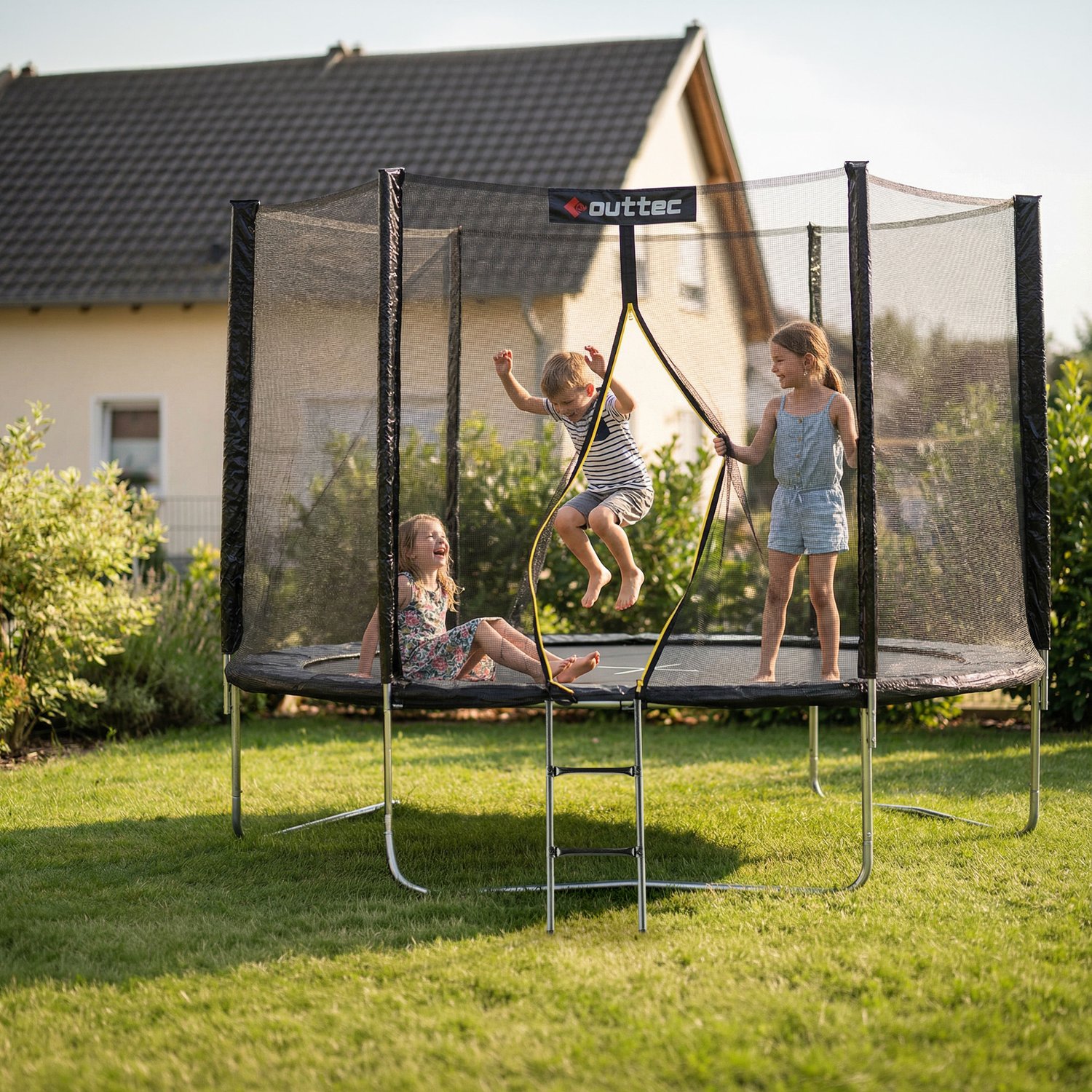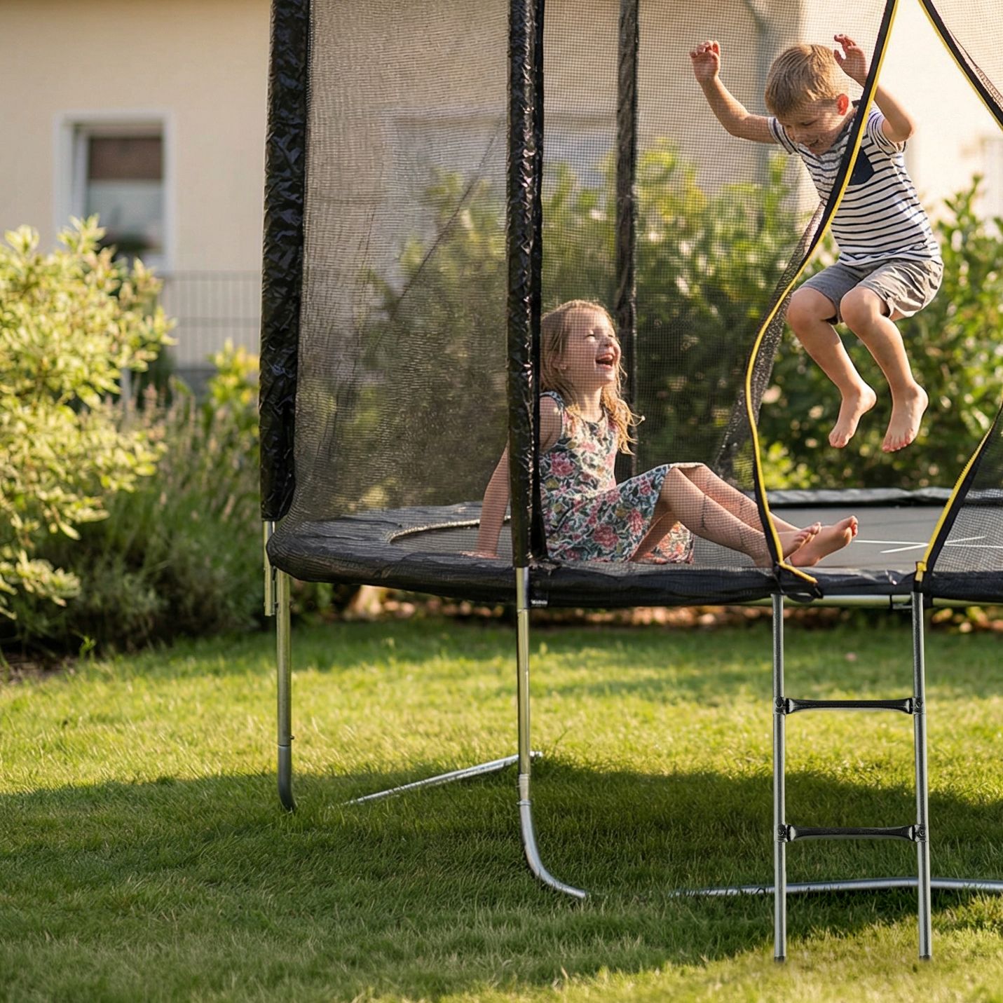 Szerokie wejście, dwupoziomowa drabinka oraz intuicyjny system montażu sprawiają, że z trampoliny można korzystać niemal od razu po złożeniu. Przemyślana konstrukcja ułatwia dostęp dzieciom i dorosłym, a stabilne stopnie drabinki pomagają w wygodnym wchodzeniu i schodzeniu z maty.