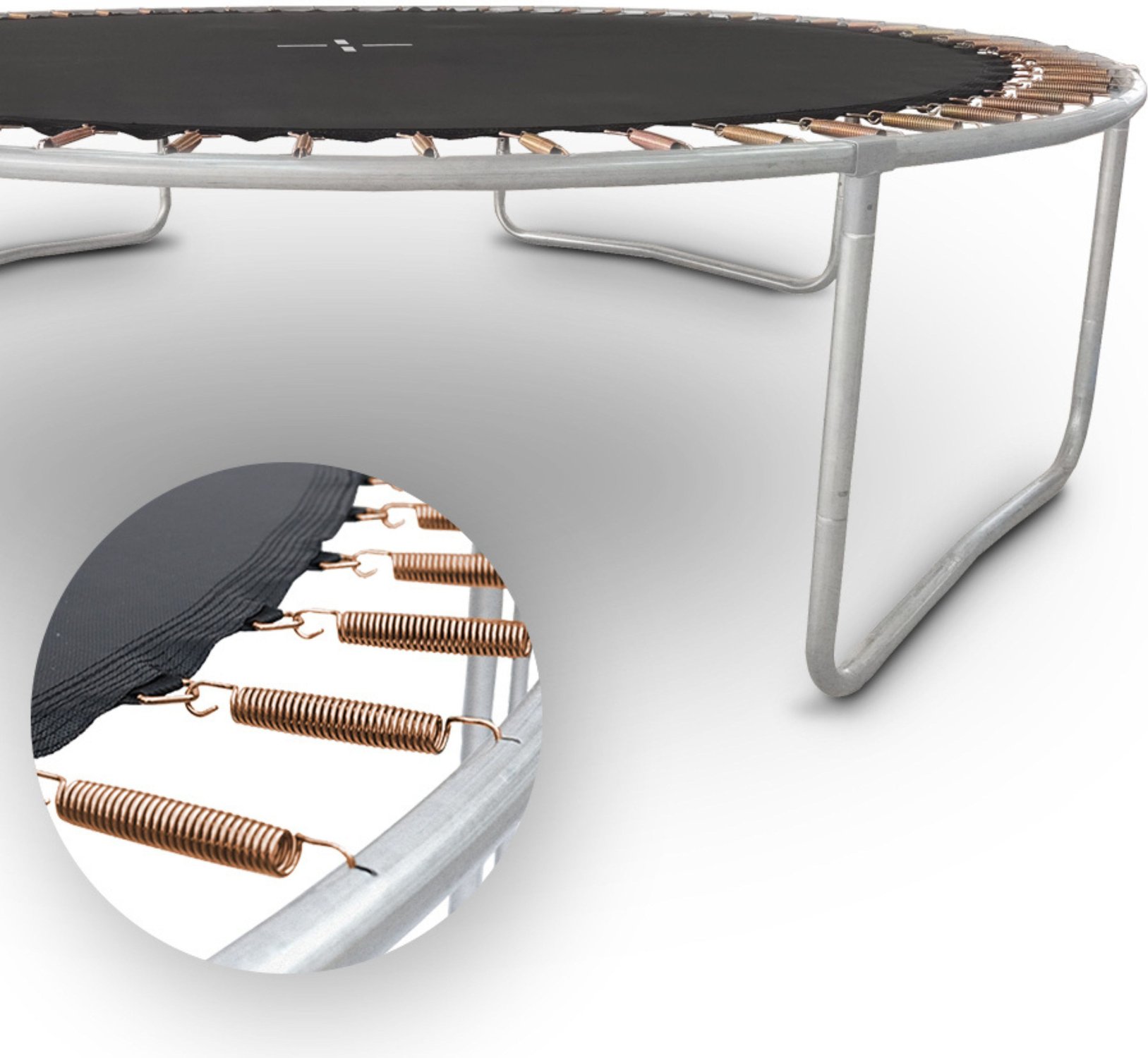 - Wzmocniony stelaż: Wzmocnione profile i stal o podwyższonej wytrzymałości sprawiają, że stelaż trampoliny jest wyjątkowo trwały i odporny na przeciążenia – zachowuje swój kształt nawet po wielu sezonach intensywnego użytkowania.
