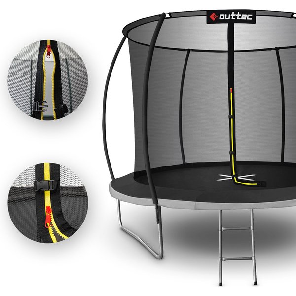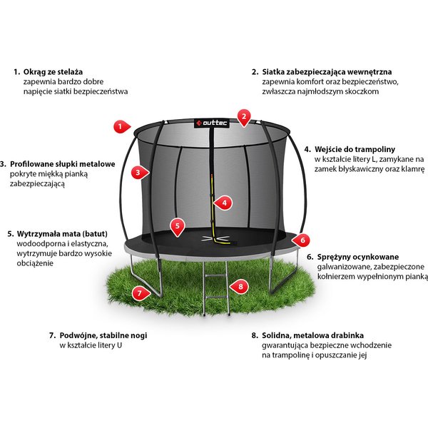 Wysoka odporność na działanie warunków atmosferycznych to kolejna zaleta trampoliny Pumpkin. Wszystkie sprężyny zostały ocynkowane i w ten sposób zabezpieczone przed korozją. Trampolina może więc stać w ogrodzie od wczesnej wiosny do późnej jesieni, bez obaw, że po jednym sezonie będzie do wyrzucenia. Trampoliny z siatką wewnętrzną są bezpieczniejsze dla dzieci niż te z siatką zewnętrzną. W ich przypadku zalecane jest skakanie blisko środka batutu. Trampolina Outtec spełnia wszystkie normy bezpieczeństwa Unii Europejskiej.
