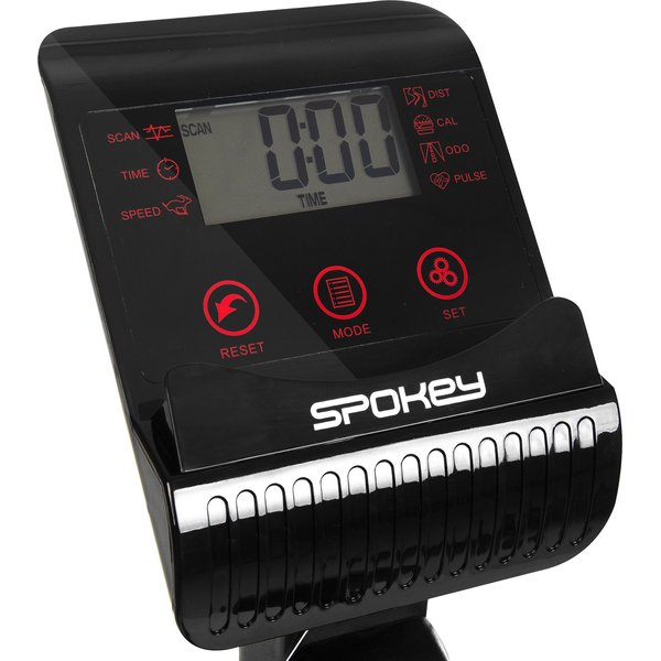 Komputer treningowy z czytelnym wyświetlaczem, na którym zobaczysz najważniejsze parametry swojego treningu: puls, scan, czas, prędkość, dystans, przebieg całkowity