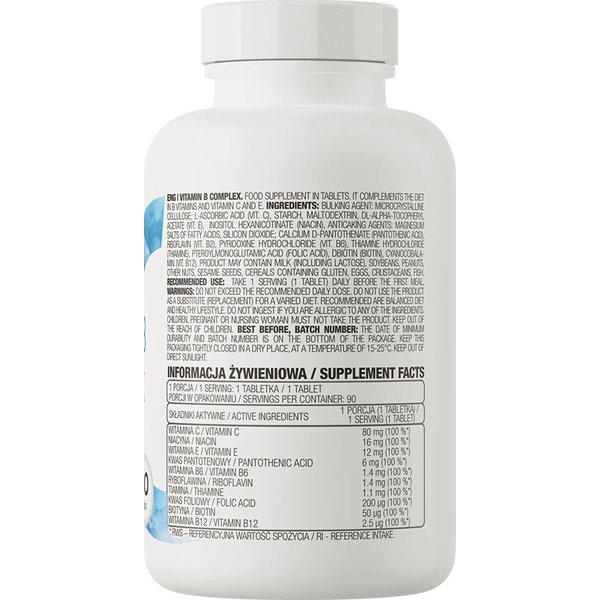 Vitamin B Complex marki OstroVit to suplement diety zawierający w swoim składzie witaminy z grupy B, wzbogacony o witaminę C i E.