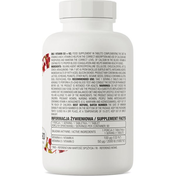 Suplement diety Vitamin D3+K2 OstroVitu to połączenie niezwykle cennych i ważnych dla organizmu witamin takich jak K2 i D3. Witamina K2 MK-7 zastosowana w preparacie jest odmianą najlepiej przyswajalną, otrzymywaną w procesie fermentacji bakterii Bacillus subtilis natto. Witamina K2 jest niezwykle ważna dla układu krążenia. Reguluje procesy krzepnięcia krwi i odpowiada za prawidłowe gojenie się ran. Ponadto wpływa na odpowiednią mineralizację kości, zwiększając ich odporność na złamania.