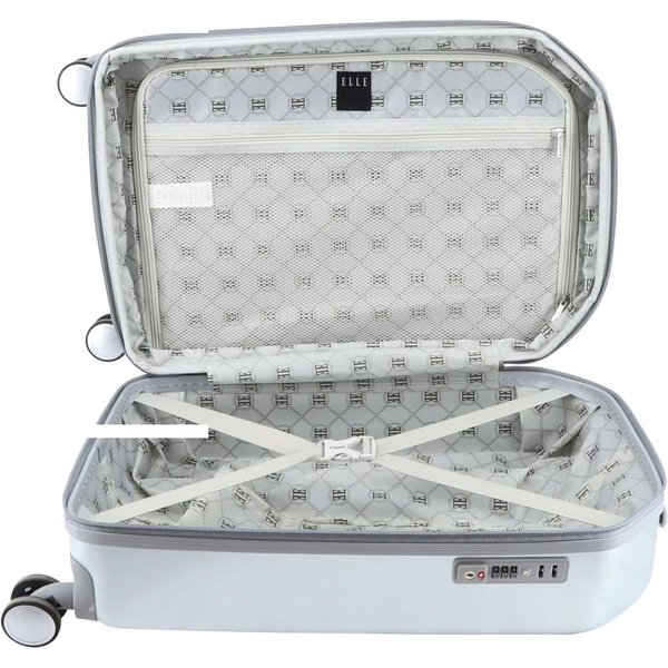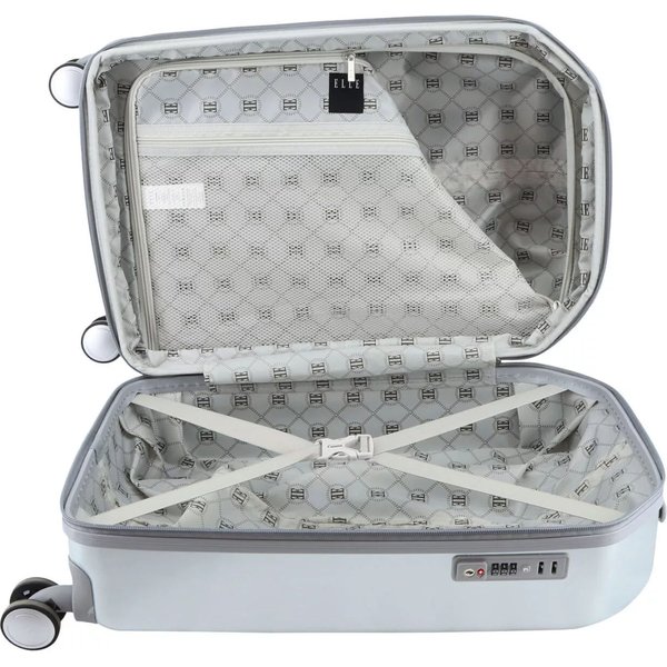 Bezpieczeństwo Twojego bagażu jest priorytetem, dlatego walizka wyposażona jest w płaski zamek szyfrowy TSA. To rozwiązanie nie tylko chroni zawartość przed dostępem osób niepowołanych, ale także ułatwia procedury kontrolne na lotniskach, gdzie zamek TSA jest standardem bezpieczeństwa. Wnętrze walizki Diamond 32L Elle zostało zaprojektowane z myślą o funkcjonalności i organizacji. Podzielone na dwie części, oferuje komorę zapinaną na suwak z dodatkową kieszenią zamykaną na suwak oraz główną komorę z elastycznymi pasami zabezpieczającymi ubrania przed przemieszczaniem. Wnętrze wykończone zostało elegancką podszewką z wzorem, co podkreśla luksusowy charakter produktu. Ponadto, wewnętrzna kieszeń z siatki umożliwia przechowywanie drobiazgów, które chcesz mieć pod ręką, takich jak kosmetyki czy dokumenty. Z zewnątrz walizka zdobi metalowe logo marki, które stanowi subtelny, ale wyrazisty akcent, potwierdzający jej prestiżowe pochodzenie.