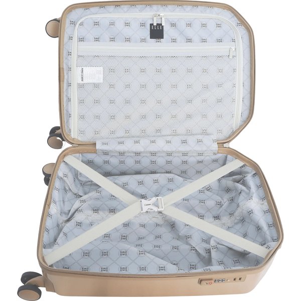 Bezpieczeństwo Twojego bagażu jest priorytetem, dlatego walizka wyposażona jest w płaski zamek szyfrowy TSA. To rozwiązanie nie tylko chroni zawartość przed dostępem osób niepowołanych, ale także ułatwia procedury kontrolne na lotniskach, gdzie zamek TSA jest standardem bezpieczeństwa. Wnętrze walizki Diamond 32L Elle zostało zaprojektowane z myślą o funkcjonalności i organizacji. Podzielone na dwie części, oferuje komorę zapinaną na suwak z dodatkową kieszenią zamykaną na suwak oraz główną komorę z elastycznymi pasami zabezpieczającymi ubrania przed przemieszczaniem. Wnętrze wykończone zostało elegancką podszewką z wzorem, co podkreśla luksusowy charakter produktu. Ponadto, wewnętrzna kieszeń z siatki umożliwia przechowywanie drobiazgów, które chcesz mieć pod ręką, takich jak kosmetyki czy dokumenty. Z zewnątrz walizka zdobi metalowe logo marki, które stanowi subtelny, ale wyrazisty akcent, potwierdzający jej prestiżowe pochodzenie.
