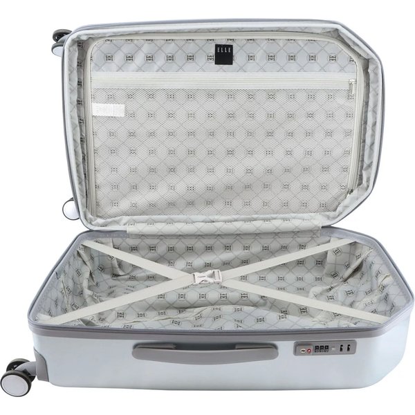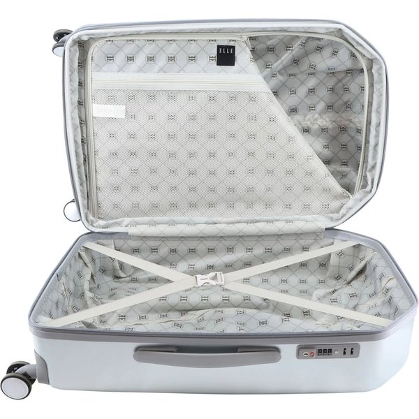 Bezpieczeństwo Twojego bagażu jest priorytetem, dlatego walizka wyposażona jest w płaski zamek szyfrowy TSA. To rozwiązanie nie tylko chroni zawartość przed dostępem osób niepowołanych, ale także ułatwia procedury kontrolne na lotniskach, gdzie zamek TSA jest standardem bezpieczeństwa. Wnętrze walizki Diamond Elle zostało zaprojektowane z myślą o funkcjonalności i organizacji. Podzielone na dwie części, oferuje komorę zapinaną na suwak z dodatkową kieszenią zamykaną na suwak oraz główną komorę z elastycznymi pasami zabezpieczającymi ubrania przed przemieszczaniem. Wnętrze wykończone zostało elegancką podszewką z wzorem, co podkreśla luksusowy charakter produktu. Ponadto, wewnętrzna kieszeń z siatki umożliwia przechowywanie drobiazgów, które chcesz mieć pod ręką, takich jak kosmetyki czy dokumenty. Z zewnątrz walizka zdobi metalowe logo marki, które stanowi subtelny, ale wyrazisty akcent, potwierdzający jej prestiżowe pochodzenie.