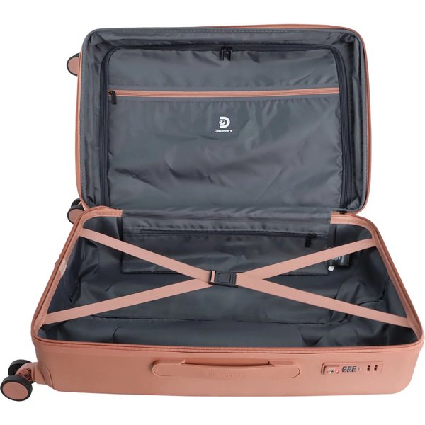 Walizka charakteryzuje się również nowoczesnym designem z logo na przedniej stronie, co nadaje jej niepowtarzalny wygląd. Oferująca pojemność 71 litrów i ważąca zaledwie 3,7kg, walizka na kółkach Discovery to idealny towarzysz podróży dla każdego, kto ceni sobie komfort, styl i bezpieczeństwo. Niezawodna, funkcjonalna i stylowa - ta walizka spełni oczekiwania nawet najbardziej wymagających podróżników.