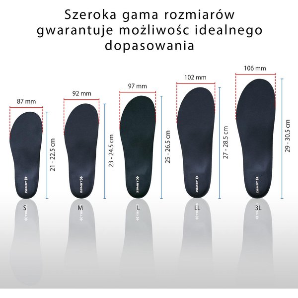 Wkładki dodatkowo amortyzują wstrząsy, co docenisz podczas spacerów na twardej nawierzchni. Materiał wkładki jest bezpieczny dla skóry i jest przyjemny w dotyku. Wkładki są również lekkie. Ten model dopasujesz do długości stopy.