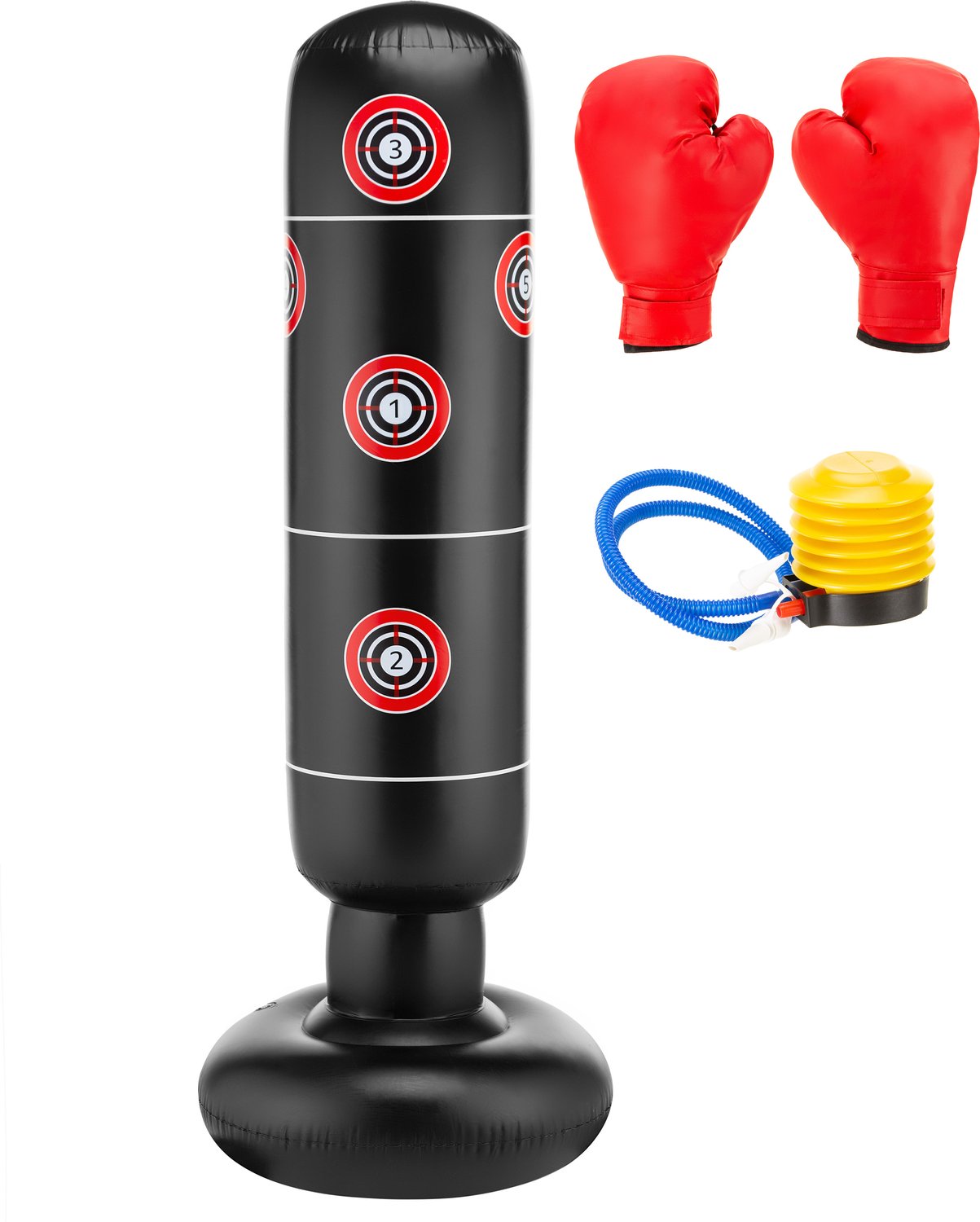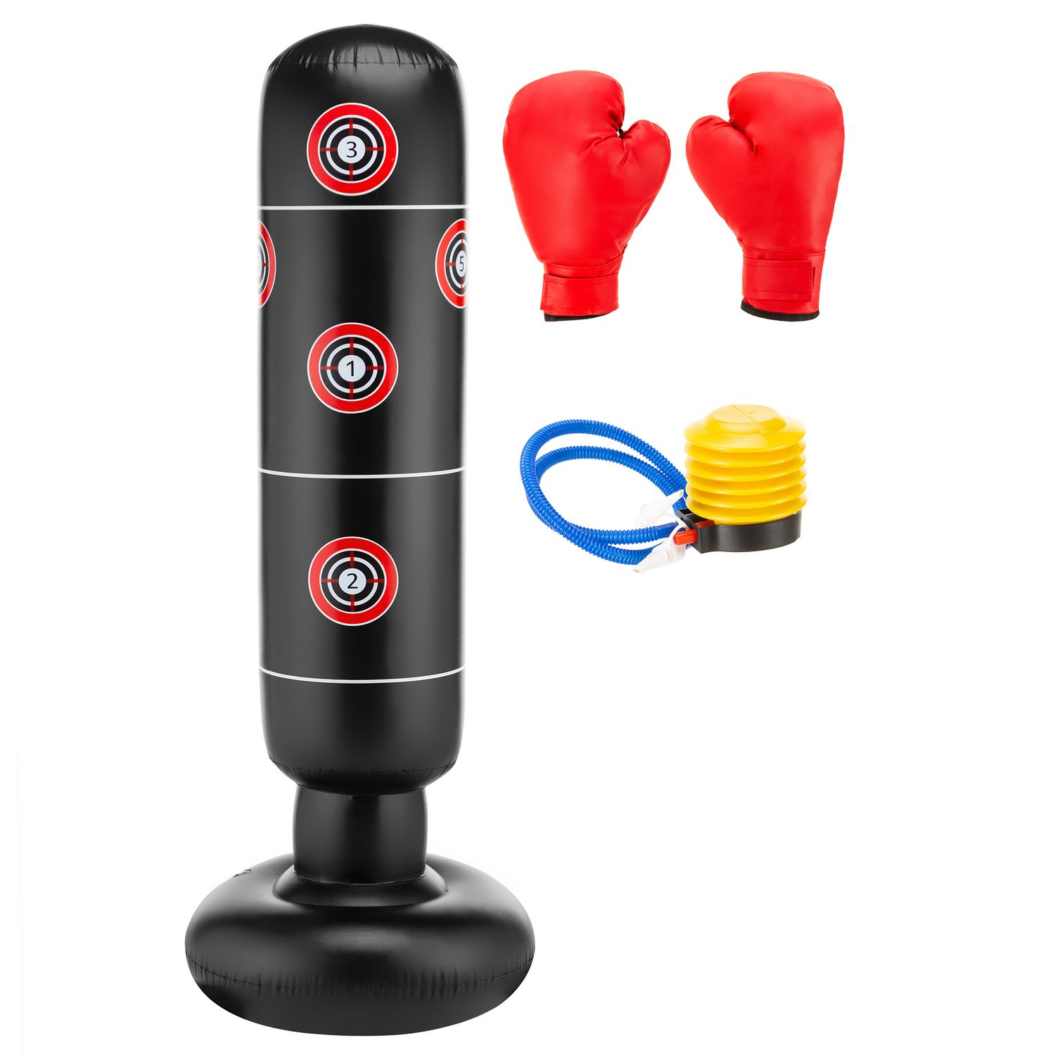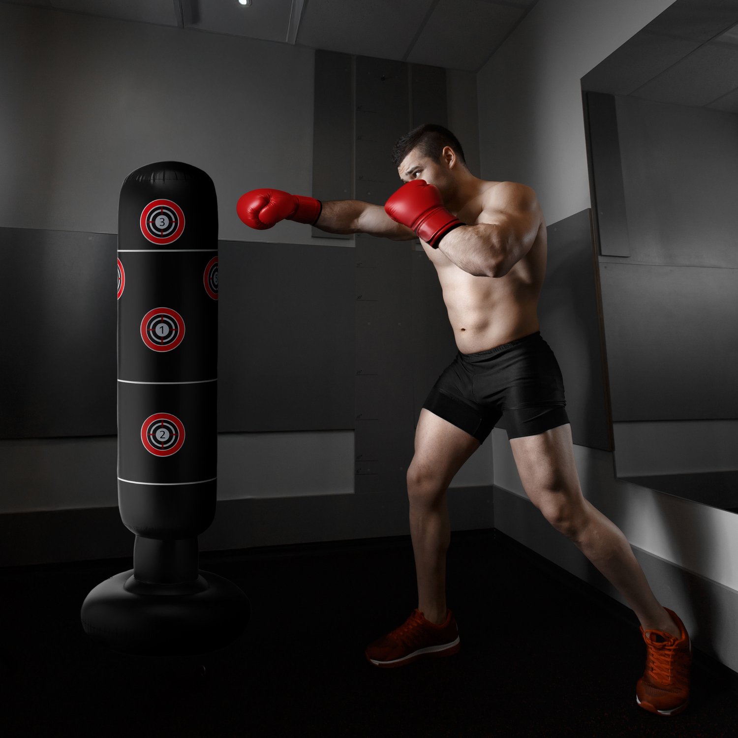 - Natychmiastowa gotowość do treningu: Dołączone akcesoria umożliwiają szybkie napompowanie worka i założenie rękawic, co pozwala rozpocząć ćwiczenia bez opóźnień.