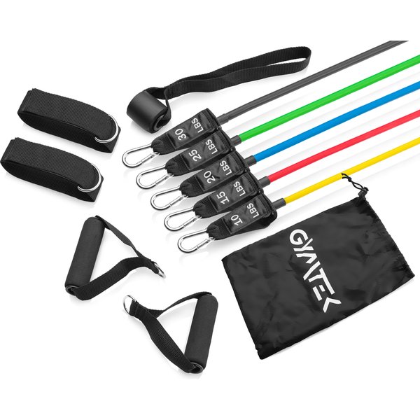 Funkcjonalny i wielozadaniowy zestaw do ćwiczeń marki Gymtek, składający się z ekspanderów, podwójnego koła oraz uchwytów do pompek, umożliwia komfortowe przygotowanie się do treningu funkcjonalnego.