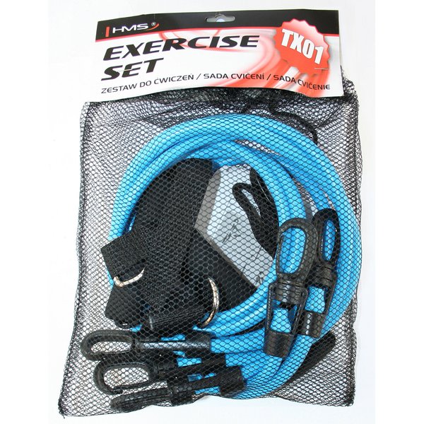 Zestaw TX01 składa się z 3 - gum oporowych, 2 - piankowych uchwytów na ręce, 1 - uchwyt na kostkę, 1 - uchwyt pod drzwi. Każda para linek ma inną sztywność co pozwala wybrać różną intensywność ćwiczeń oporowych. Na każdej z linek znajduje się uchwyt, który umożliwia realizację kompleksowych ćwiczeń siłowych na wszystkie grupy mięśni.
