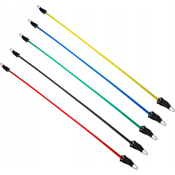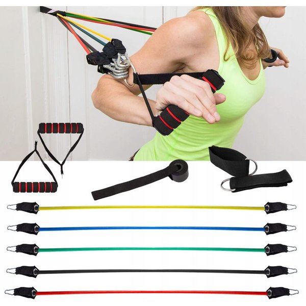 W zestawie znajduje się z 5 gum o różnym oporze, 2 uchwyty na ręce, 2 uchwyty na kostki, uchwyt na drzwi oraz pokrowiec. Każdy ekspander różni się nie tylko oporem, ale również kolorem oraz średnicą, co pozwoli Ci jeszcze bardziej urozmaicić trening. Natomiast możliwość zróżnicowanego mocowania pozwala ćwiczyć każdą partię mięśni.