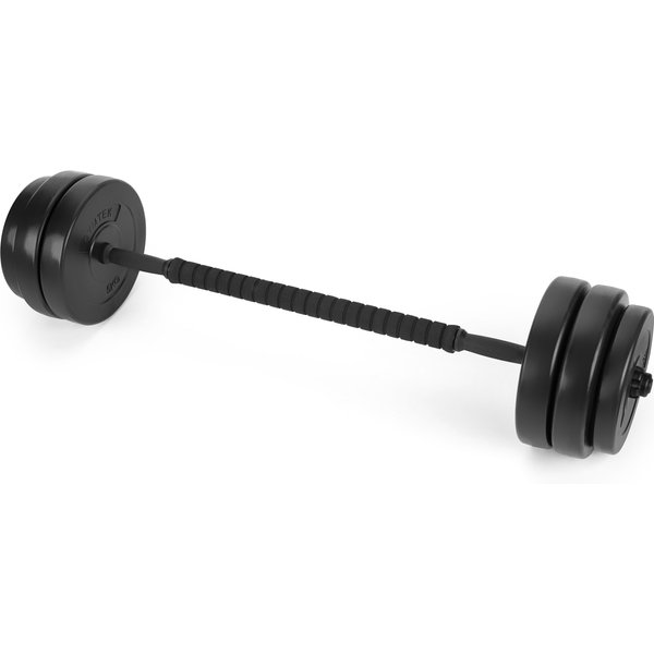 Komplet składa się z czterech talerzy obciążeniowych o wadze 1 kg, czterech talerzy o wadze 1,25 kg, czterech talerzy o wadze 2,5 kg oraz czterech talerzy o wadze 5 kg. Taki zestaw pozwala na szeroką gamę kombinacji, co umożliwia precyzyjne dopasowanie obciążenia do rodzaju i intensywności ćwiczeń. Obciążenia mają standardową średnicę otworu 28 mm, co zapewnia ich kompatybilność z dołączonymi gryfami. Zestaw zawiera dwa krótkie gryfy i dwa uchwyty do kettlebell, co dodatkowo zwiększa jego wszechstronność. Gryfy mają antypoślizgową powierzchnię, co gwarantuje pewny chwyt i bezpieczeństwo podczas intensywnych treningów. Dzięki gwintowanym końcówkom oraz czterem nakrętkom gwiazdkowym, talerze obciążeniowe są stabilnie i bezpiecznie zamocowane.
