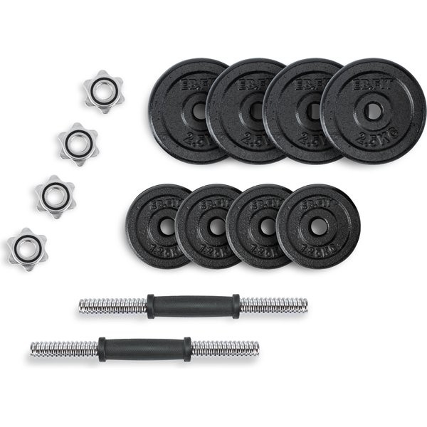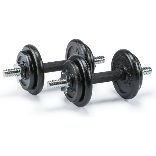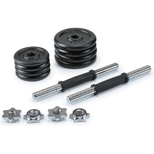 - 8 sztuk żeliwnych, chromowanych obciążników: 4x2,5 kg i 4x1,25 kg