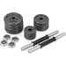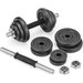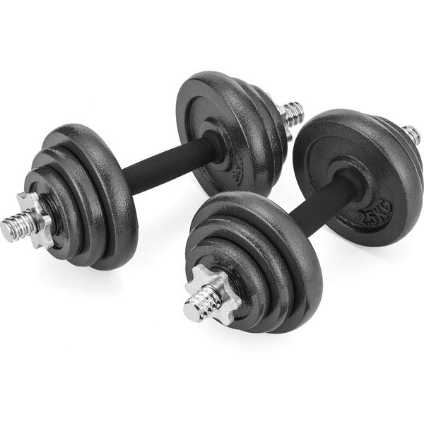 - Kompletny zestaw do treningu siłowego: Dwa gryfy, zestaw żeliwnych talerzy i nakrętki umożliwiają wykonywanie różnorodnych ćwiczeń, angażujących różne partie mięśniowe.