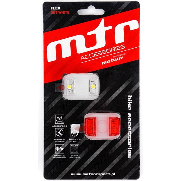 Zestaw uniwersalnych i funkcjonalnych lampek rowerowych Flex od Meteor, zadba o Twoje bezpieczeństwo i widoczność podczas wieczornych wyjazdów na rowerze.