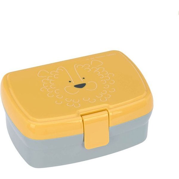 Zestaw Lassig About Friends to funkcjonalne pudełko śniadaniowe oraz bidon z ustnikiem - obie rzeczy mają na sobie wizerunek lwa.