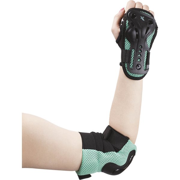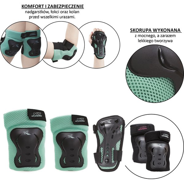 Wybierając ten komplet otrzymasz po 2 ochraniacze na kolana, łokcie i nadgarstki, co stanowi skuteczną zbroję zabezpieczającą najbardziej narażone na urazy części ciała. W nich początki na rowerze, desce, czy rolkach to nic, czego należałoby się obawiać. Skorupa ochraniaczy wykonana została z mocnego tworzywa, a jego pozostała część jest wysoce przewiewna, możesz więc bez przeszkód pracować nad nowymi trikami w upalne dni. Mocne zapięcie na rzep utrzymuje ochraniacze na swoim miejscu aż do ściągnięcia, a po zakończonej jeździe wrócisz do domu z ochraniaczami umieszczonymi w poręcznym pokrowcu z siatki.