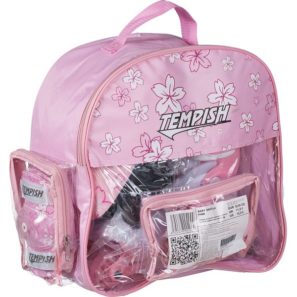 Zestaw dziecięcy w plecaku składający się z rolek regulowanych, kasku i ochraniaczy Tempish Baby Skate. Rolki przeznaczone do jazdy rekreacyjnej i fitness (kondycyjna), niskie i średnie obciążenie, dla początkujących i średnio zaawansowanych użytkowników