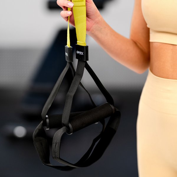 - Pełna elastyczność montażu: Dodatkowy pasek przedłużający umożliwia łatwe dostosowanie długości taśm do różnych warunków treningowych i wysokości zawieszenia.