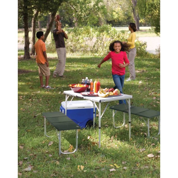 Jednym z kluczowych atutów tego zestawu jest jego praktyczność. Możliwość złożenia stołu i ławek do jednej kompaktowej walizki z poręcznym uchwytem sprawia, że transport i przechowywanie stają się niezwykle łatwe. Dzięki temu, nawet w najmniejszym bagażniku samochodu znajdzie się miejsce dla tego zestawu. Wspierając mobilność, Coleman zadbał o to, aby każdy element można było złożyć i rozłożyć w szybki i intuicyjny sposób, co pozwala na maksymalne skupienie się na cieszeniu się czasem spędzonym na łonie natury. Aluminiowa konstrukcja zapewnia nie tylko trwałość, ale i lekkość całego zestawu. Ważący zaledwie 10,5 kg, zestaw można z łatwością przenosić, nie martwiąc się o jego wytrzymałość. Aluminium to materiał odporny na korozję, co jest niezwykle ważne w przypadku użytkowania mebli na zewnątrz, narażonych na różne warunki atmosferyczne.