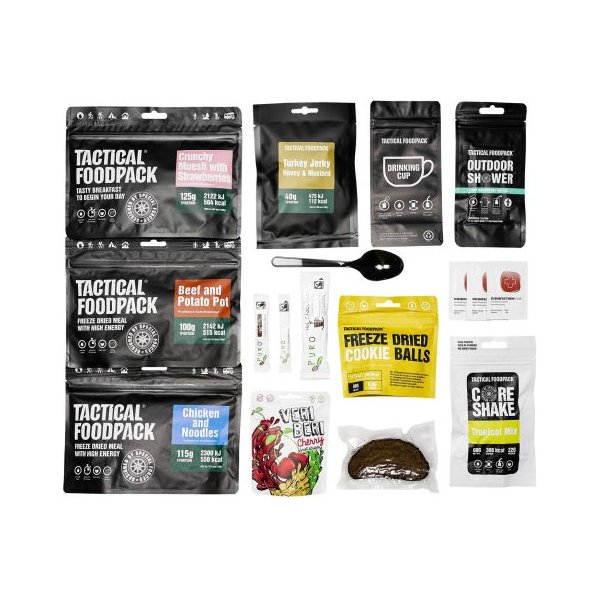 - w zestawie: liofilizat chrupiące musli z truskawkami, liofilizat gulasz z wołowiną i ziemniakami, liofilizat danie z kurczakiem i makaronem, chleb żytni, napój białkowy Core Shake Tropical Mix, suszony indyk Turkey Jerky Honey & Mustard, chipsy z wiśni, liofilizowane kulki ciasteczkowe, gorąca czekolada, kawa, cukier, łyżka, kubek, myjki do ciała, waciki do dezynfekcji